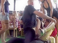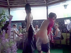 Euro sweetheart double penetration drilled in restaurant
