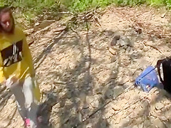 Hotty with plug in the a-hole positions for a lad at a public beach