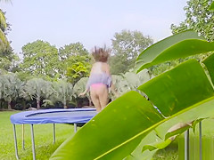 Huge pantoons hottie bouncing on trampoline