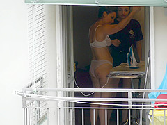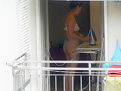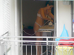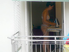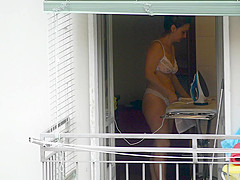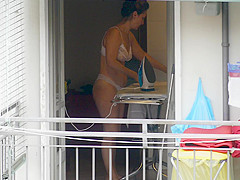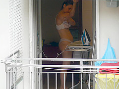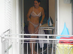 As that babe was ironing by the open window in sheer pants and brassiere, this sexy mother I'd like to fuck disclosed her large gazoo and whoppers to my camera.