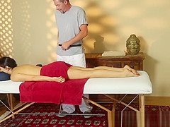 Breasty girl deepthroating her masseurs rod