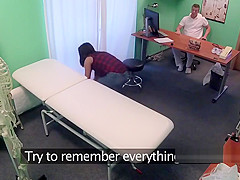Kind doctor bangs hot brunette hair patient