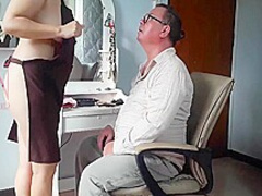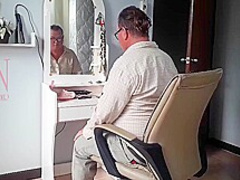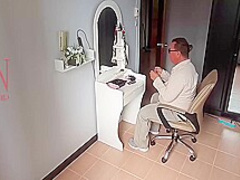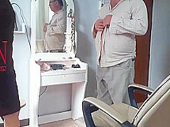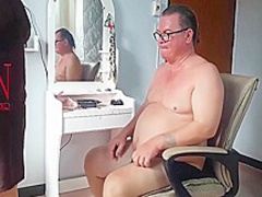 Nudist Barbershop. Undressed Lady Hairdresser In An Apron Makes Client To Undress. The Client Is Surprised. S1