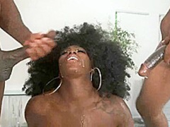 A darksome woman with large meatballs bonks with 2 blacks in a group sex