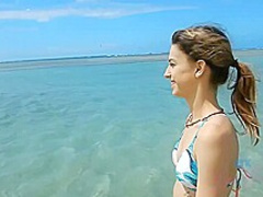 Lewd nudist gal sucks weenie from stranger boyz on the beach