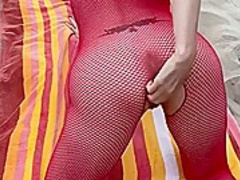 Hotty with plug in the a-hole positions for a lad at a public beach