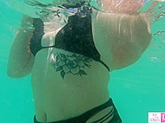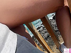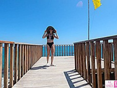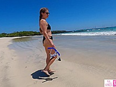 Hawt golden-haired roaming around public beach in bikini and fucking