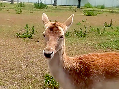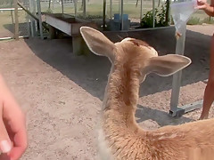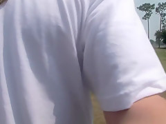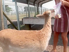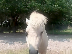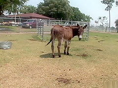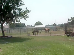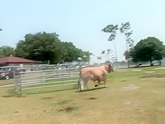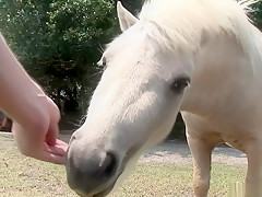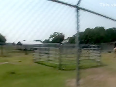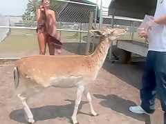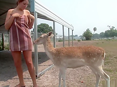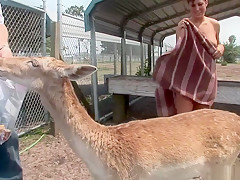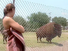 This is one for the record books, as u'll watch this cute redheaded college classy, walking around outdoors, with merely a towel wrapped around her, until that babe comes up on a fenced in area and that's when that babe takes off her towel, letting u watch her giant tattooed knockers, along with her totally bald cookie, as that babe tries riding a four legged furry creature!