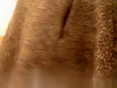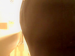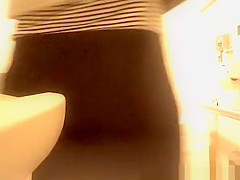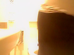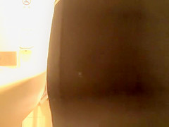 Oriental woman caught in public latrine peeing and cleaning her muff in advance of pulling her her black nylons and her costume down.