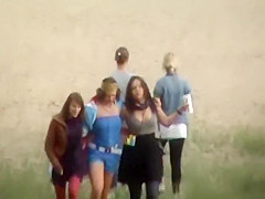 Drunk gals were walking throughout the park, kidding around loudly and dancing as they hopped throughout the park. Voyeur was on their tail from a safe distance and this chab filmed 'em when they all stopped to take a urinate. This Guy even zoomed in on the nasty stuff.