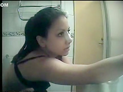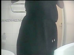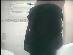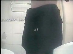 Hidden camera in washroom catches beauty in dark clothing taking 'em out to take a pee. Whilst peeing that babe checks her smart phone for messages.