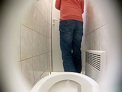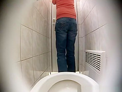 Woman in red hood and jeans panties squats to take a pee in public lavatory with a hidden camera.