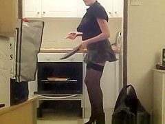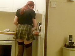 Lengthy hair redhead wife in short petticoat and high heels cooking the dinner in kitchen whilst her dude films her and lifts her petticoat to discharge her bald vagina.