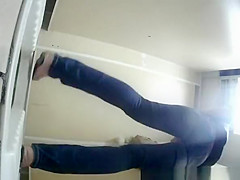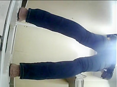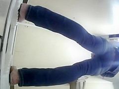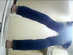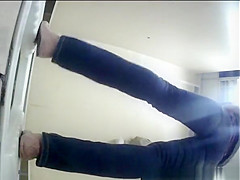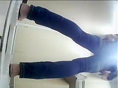Description: Woman spied by hidden camera pulling down her constricted jeans panties and peeing.