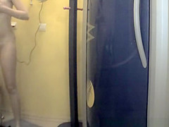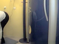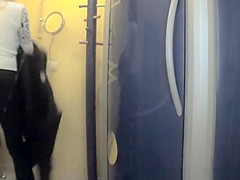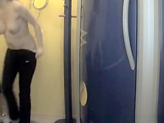 Admirable zeppelins and hairless twat preggo woman undressing in the solarium change cabin and putting some protection cock juice on her body.