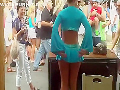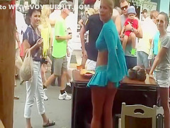 Sexy golden-haired in short blue petticoat wind upskirt