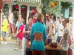 Sexy golden-haired in short blue petticoat wind upskirt on her white strap and tattoo.