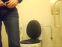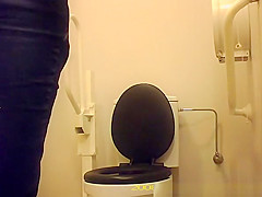 Hotty with tiny bush love tunnel squatting over throne-room to take a pee. This Babe cleans her muff after and pulls up pants and panties.