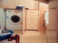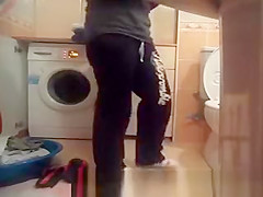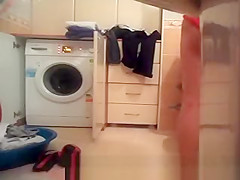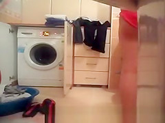 Hidden washroom spy camera catches breasty woman taking off her t-shirt, brassiere and likewise her red pants.