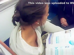 Swarthy sweetheart down blouse in subway