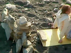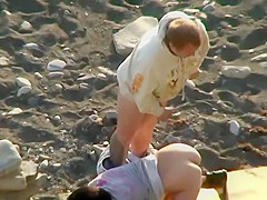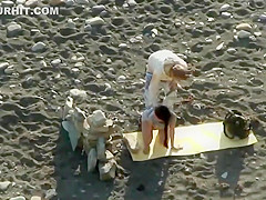 Lewd nudist gal sucks weenie from stranger boyz on the beach