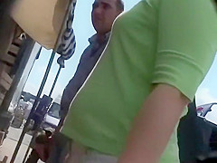 Voyeur was holding his camera down and this chab managed to receive a good peek underneath a short petticoat, seeing that this babe either isn't wearing pants or that strap is lost betwixt large ass cheeks this babe got down in that upskirt.