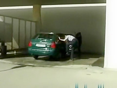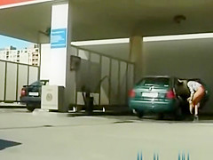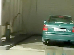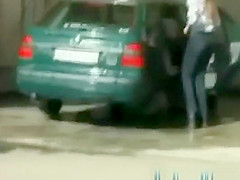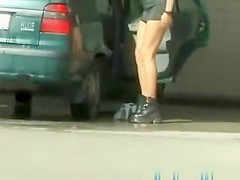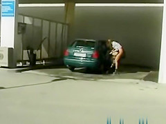Wicked angel removes panties and put on short petticoat then peeing on public at car wash station at daylight during the time that her ally films on her