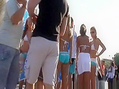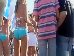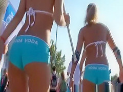 Description: Sexy promotional hotties with great butts and cameltoes in very taut blue shorts.