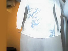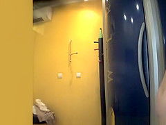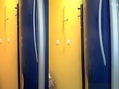 Corpulent woman spied in tanning room undressing and dressing for tanning session.