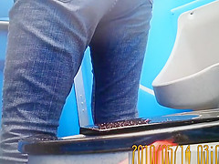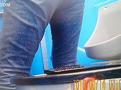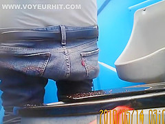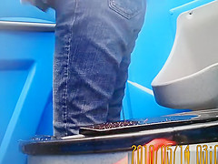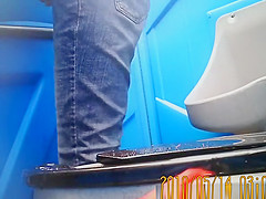 Woman caught by hidden camera in portable throne-room pulling down her panties and pissing with her curly muff.