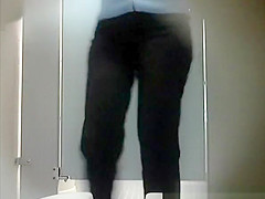 Woman pulls down her darksome panties and red pants to take a pee with her pink hairless twat.