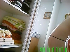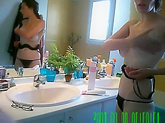Girlfriend in darksome strap takes off her shirt and put a brassiere during the time that her boyfriend follows her to bath where this babe puts skin care lotion on body and zeppelins.
