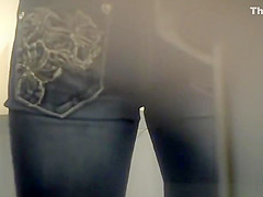 Lengthy hair legal age teenager pulls down her jeans panties and seats in water closet to pee. This Babe cleans her soaked cookie after pissing.