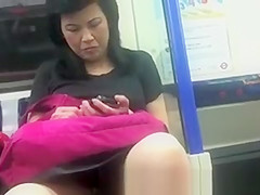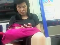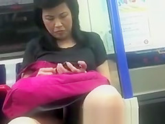 A aged Japanese woman getting off work doesn't even realize the lad sitting across from her has a clear view betwixt her legs as this babe sits on a commuter educate messing with her phone