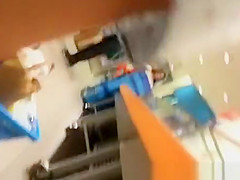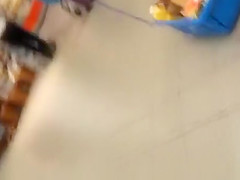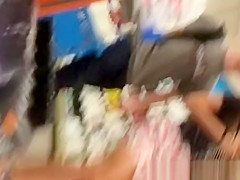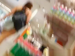 Woman in short petticoat bows over in supermarket and receives her pink pants and crotch filmed.