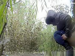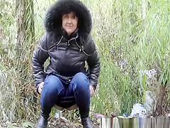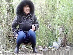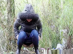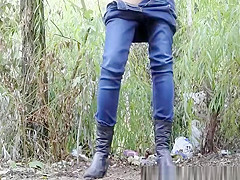 Description: Woman in darksome jacket pulls her taut jeans panties down to take a pee in the nature.