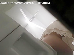 Description: Woman caught seated in public biffy taking a ooze and cleaning her moist cunt.