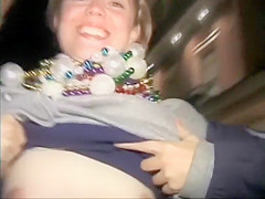 Streets were filled with drunk strumpets on this festival evening and there was music playing everywhere. This voyeur had loads of joy teasing angels and asking 'em to flash their billibongs to him. That Guy even grabbed a large boob of this smiling playgirl during the time that filming her all the time. I wonder how many condoms was used on this day.