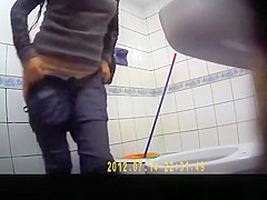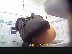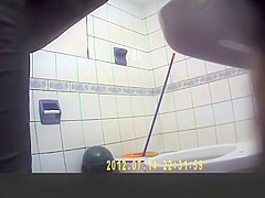 Description: Lengthy hair dark brown woman spied in public shitter taking pee and wiping her twat.