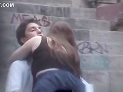 Man puts his fingers betwixt his women legs in public stairs and this babe rides him in public in plain day light.