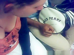 Down blouse on woman riding the subway in Paris.