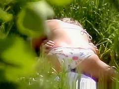 Golden-Haired beauty with her bottom bikini to the side riding her dude's schlong in the country.