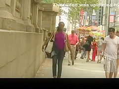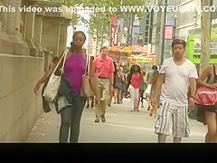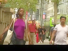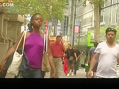Ebon cutie in purple top wearing no brassiere below it has her nipps hard and her petite scones jiggling.