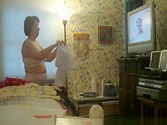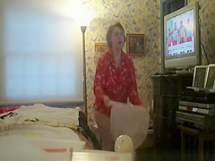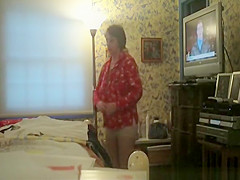 Description: Unaware wife undresses and shows her large scones