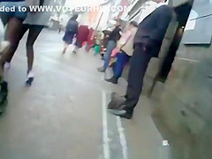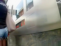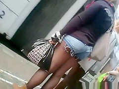 Admirable wazoo legal age teenager in taut blue jeans shorts and darksome hose expecting for the metro.