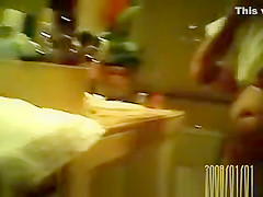 Large pantoons and bushy muff older wife drying her body after a precious warm shower and putting some skin care lotion on her arms during the time that her spouse films her.