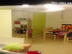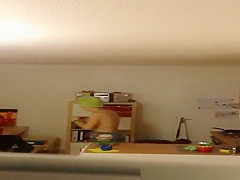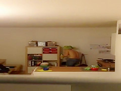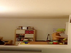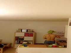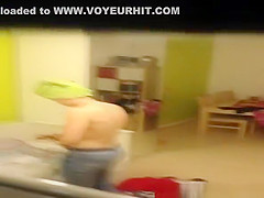 Description: Neighbour spied in her apartment topless with green towel around her head and dressing with a tooth brush in her face hole.