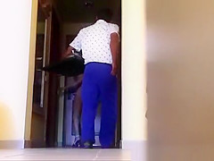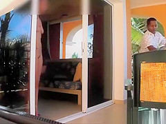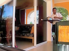 Sexy exhibitionist woman attended the door to the resort worker carrying some food. That Guy enters the apartment and places the food at the table with this hawt woman with trimmed snatch all stripped.