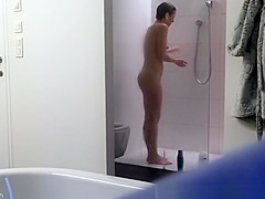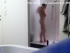 Tiny scones woman with bushy slit caught showering by hidden camera concealed in baths.