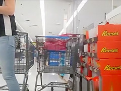 Blond woman in constricted jeans panties in supermarket expecting for a ally near their shopping carts.